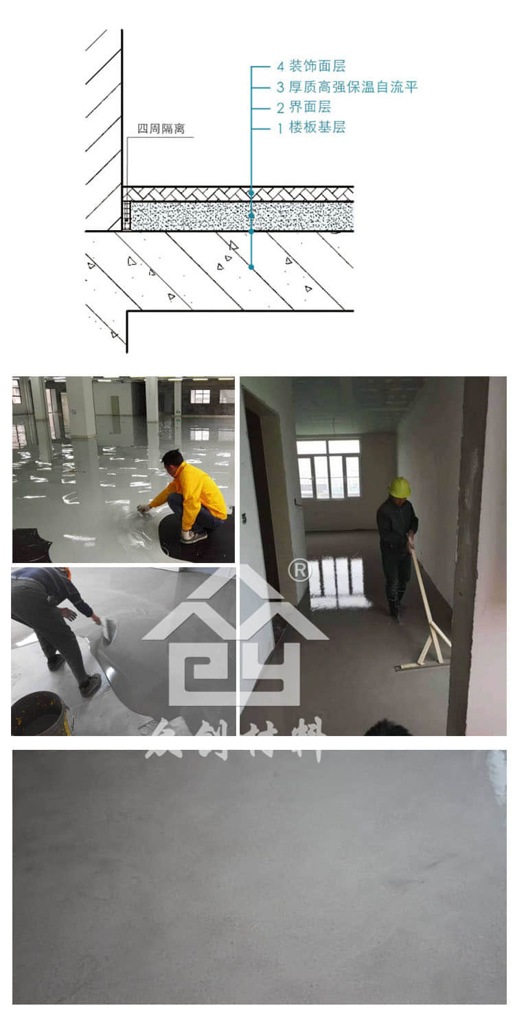 高強(qiáng)度自流平砂漿是一種新型的樓板保溫找平一體系統(tǒng)和地暖回填材料。它以水泥、高強(qiáng)水泥、石膏復(fù)合做為膠凝材料,添加微晶、級(jí)配骨料、填充料、可再分散乳膠粉、及各種高分子功能添加劑等混合而成,是一款新拌時(shí)流動(dòng)性好,早期強(qiáng)度高,施工方便,平整度高,不易開(kāi)裂的新型材料。該材料可同時(shí)做為樓板保溫層與面層。