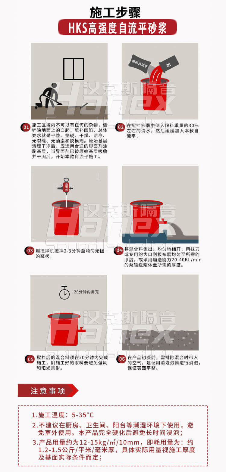 1.自流平砂漿加水量為35+2%,無(wú)需添加其他任何成份,先將水放入攪拌桶,再倒入自流平砂漿,用電動(dòng)攪拌器攪拌2-5分鐘,應(yīng)充分?jǐn)嚢杈鶆?br/> 2.基層應(yīng)堅(jiān)實(shí),并涂刷界面劑,不得漏涂和局部積液。